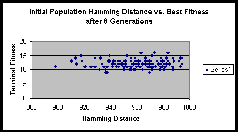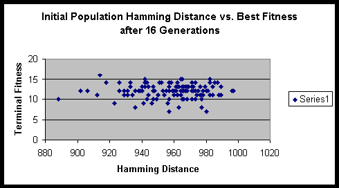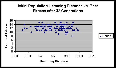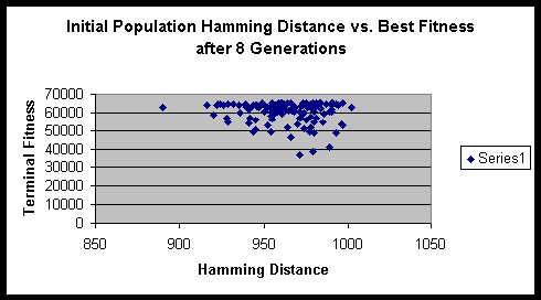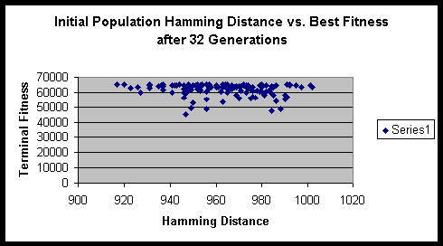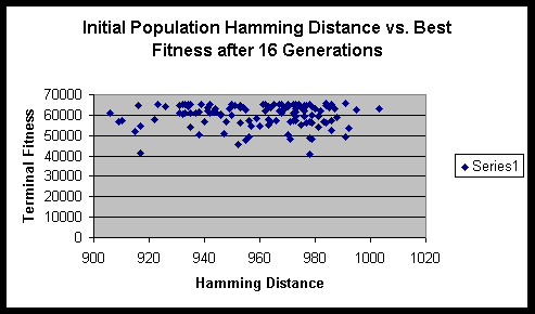 Both experiments suggested that there is minimal variance of terminal fitness of a population when the initial Hamming distance sum is in the range of 900 to 1000. On a side note, the hitch-hiking of defective alleles is apparent in these experiments. Of the several hundred runs, only a very small minority ever achieved the maximum fitness possible.